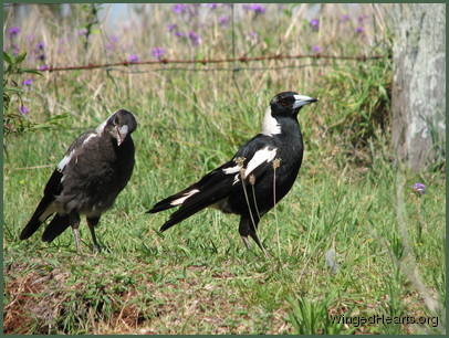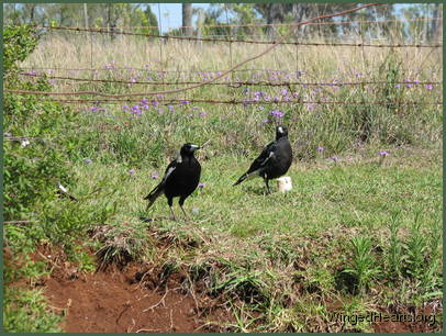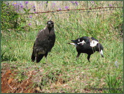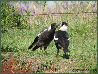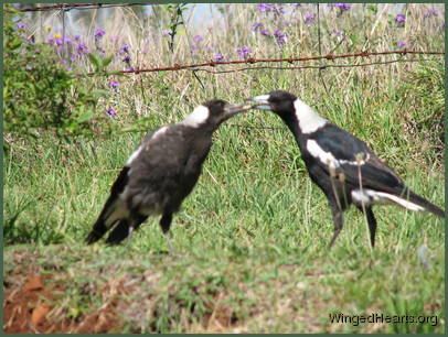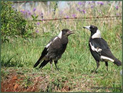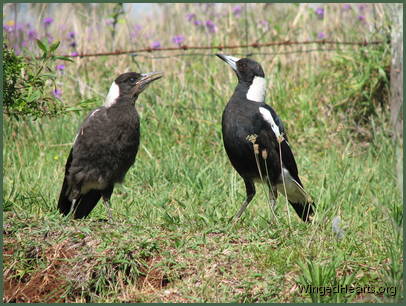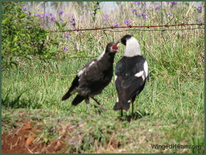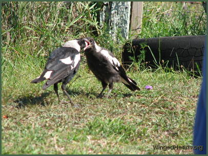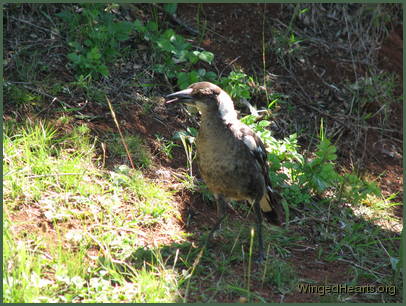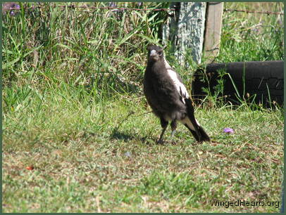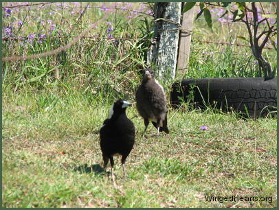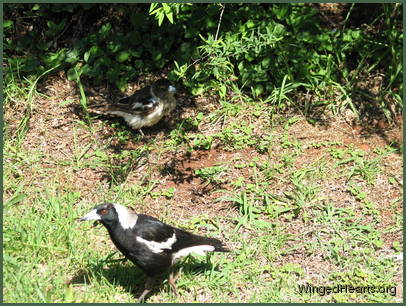These shots were taken on the first day that Vicky brought Wendy to our backyard. Wendy had been out of the nest for only a few days. Magpie chicks have dark plumage while they are still in the nest, their plumage lightens when they come out. From the colour of Wendy's chest, it seems that she had not yet lightened when she came out of the nest. Vicky trusts us and is quite confident in bringing her young chick to mix with the others. Renuthri (noisy-miner) and Sophie (two years of age) were in a trance on the bank when Vicky scatters them on her way down to get some food for Wendy. Dimpy who is the same age as Sparky hides under the may bush to catch up on his sleep, while Sparky (who is now one year old) watches her mother and younger sister sleepily from a shady spot down below.